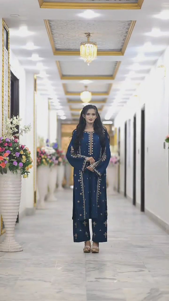 This 2PC Karndi Embroidered Suit combines traditional elegance with practical comfort. The long shirt showcases exquisite embroidery on the front and finely crafted details on the loose sleeves, reflecting superior craftsmanship. Paired with loose embroidered trousers, it offers a refined silhouette and unrestricted movement, making it an ideal choice for formal events during cooler seasons.