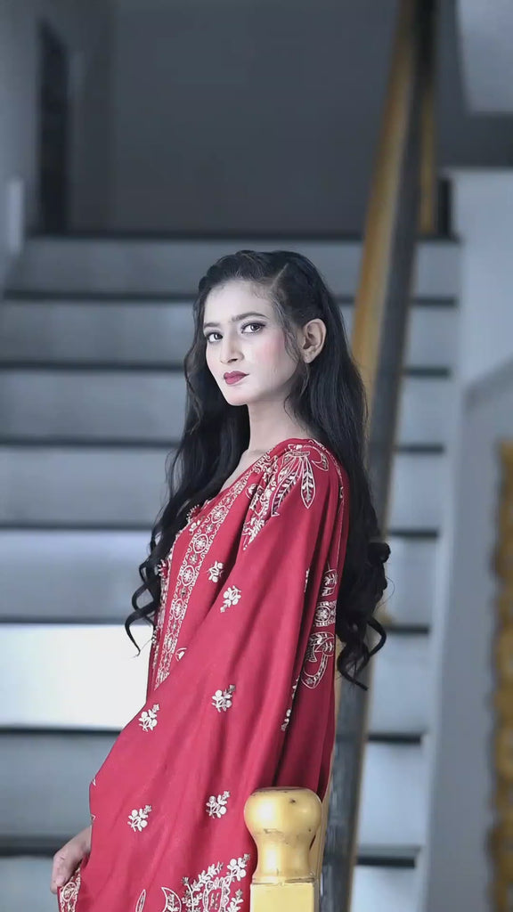 Elevate your wardrobe with this exquisite three-piece ensemble crafted from premium red Karandi fabric. The collection features a beautifully coordinated set that includes a sophisticated main garment paired with a luxurious shawl, perfect for both casual and formal occasions. Karandi's renowned durability and rich color retention ensure your pieces maintain their vibrant appearance through countless wears. The inclusion of a complementary shawl adds versatility, allowing you to style multiple looks from a single purchase. Ideal for those who appreciate quality craftsmanship and timeless elegance in traditional wear.